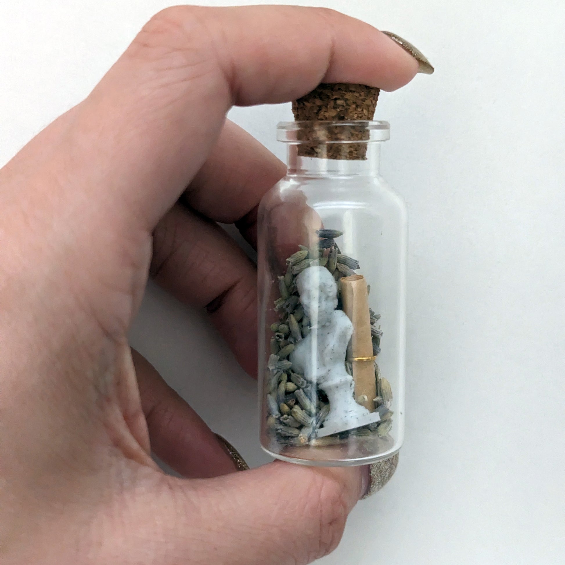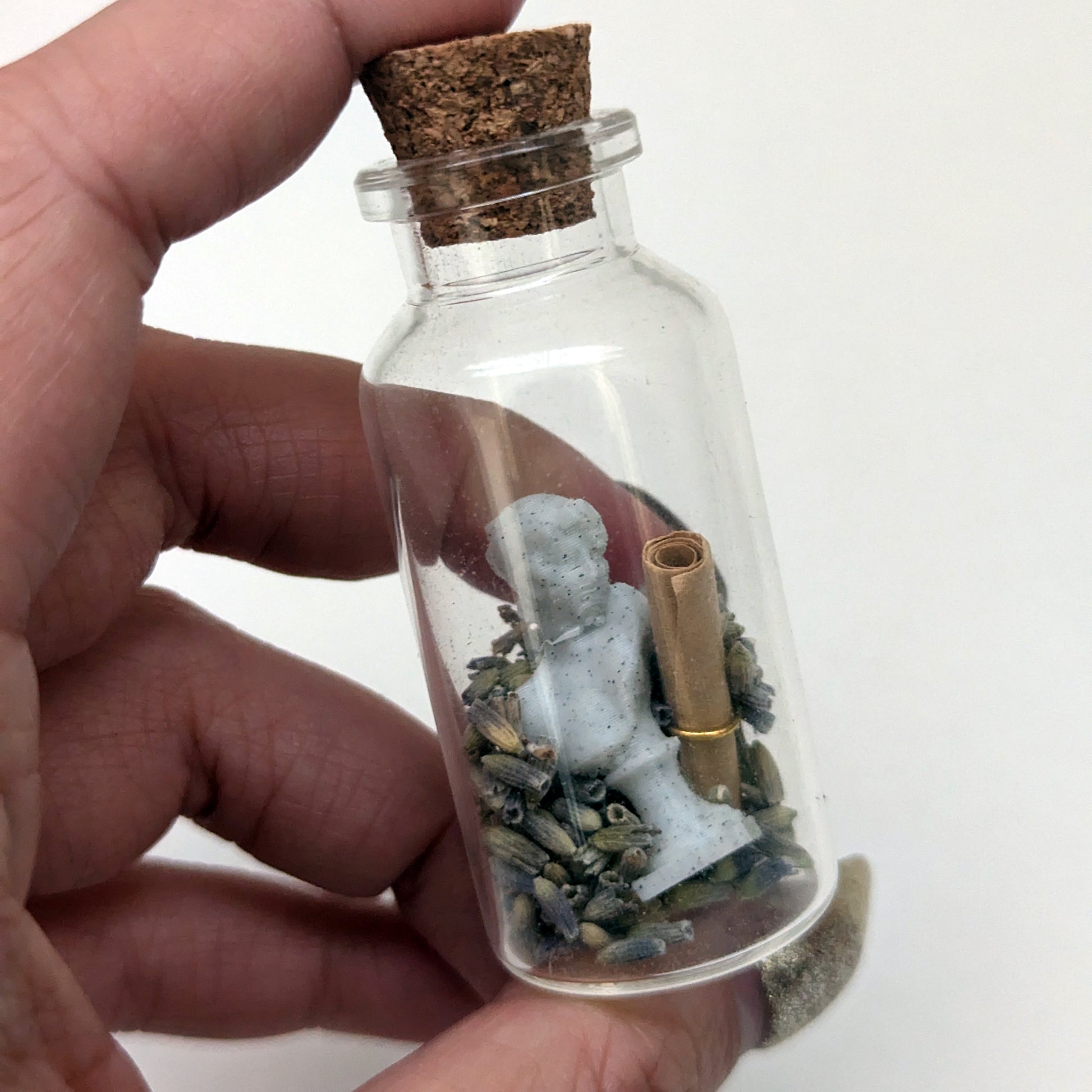 Make a wish with our lady of lesbians and poetry. This tiny glass jar comes with a tiny 3D printed bust of Sappho immersed in real dried lavender. There's also a tiny scroll for writing a love note, intention, or wish.
